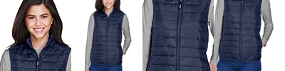 body: 1.2 oz. / 39 gsm 100% polyester with water resistant finish; lining: 100% polyester; insulation: 80 gsm thermal poly fil; center front zipper with autolock slider and reflective toggle; lower pockets with invisible zippers; stretch binding at armholes and hem; packable style into separate storage pouch;