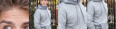 - Raw-edge seams on raglan shoulders, side gusset panels, pocket and waistband