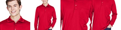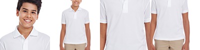4.1 oz./yd2 / 139 gsm, 100% polyester piqué with moisture-wicking, anti-microbial and UV protection performance; Matching flat-knit collar; Heat-seal label; Side slits; Two-button placket;
