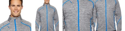 bonded with 100% polyester microfleece, 7.4 oz./yd2/; 100% polyester mélange jersey; inside storm placket with chin guard; contrast center front reverse coil zipper ; stretch storm cuffs with thumb holes; chest pocket with contrast invisible zipper; lower pockets with contrast reverse coil zippers; contrast coverstitch details; audio port access through inside left pocket; adjustable shockcord at hem;